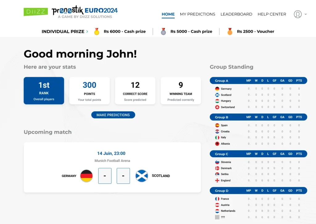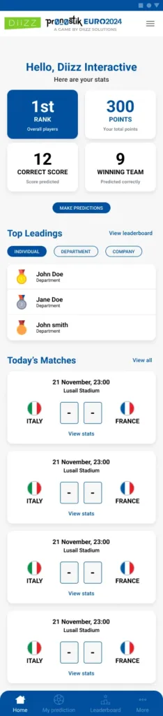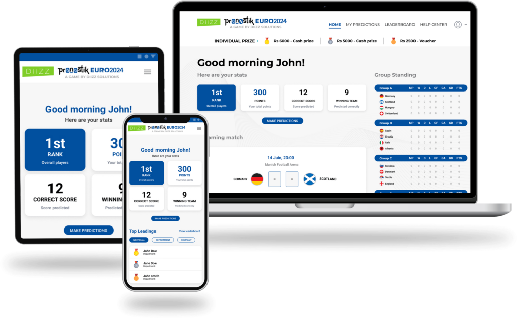 Notre plateforme de prédiction Football est l’outil parfait pour créer l’effervescence et mettre l’ambiance pour l’Euro 2024 dans votre entreprise.